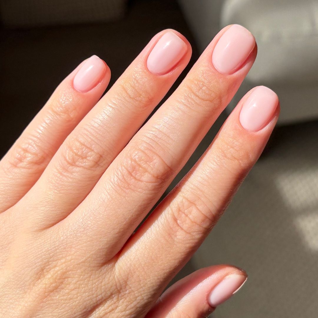 Strawberry Matcha is a soft blush pink hard gel with a creamy, semi-opaque finish that adds a sweet flush to every set